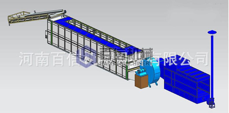 百信專用網帶式大青葉烘干機主要由轉換爐、網帶式穿流干燥機、電控系統和其他輔助部件組成。轉換爐提供熱量;網帶式穿流干燥機是干燥設備的主體,由機體和多層輸送帶組成;電控系統控制整個設備的啟動、運轉與停止。在其他輔助部件的配合下,干燥設備完成大青葉的上料、干燥與出料等工序,實現大青葉的干燥加工。